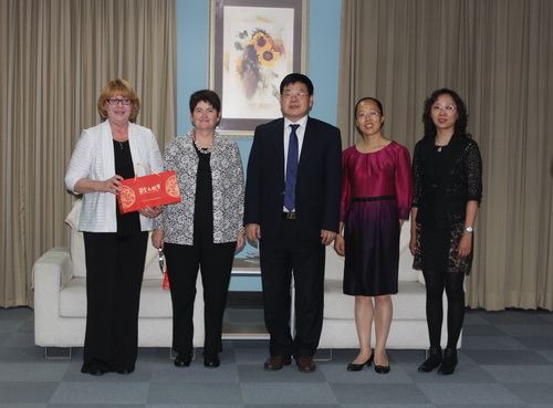 6 月 5 日 ,副校长邱立成在图书馆二楼贵宾厅亲切会见了前来参加中澳本科项目毕业典礼的澳大利亚查理斯特大学校长代表 Rowan O ’ Hagan 博士和查理斯特大学主管副校长 Heather Cavanagh 教授。国际教育学院党总支书记乔秀梅、副院长齐萱陪同会见。