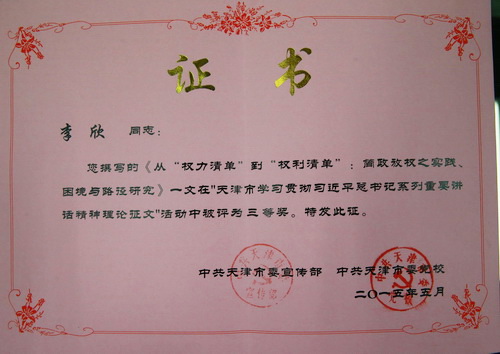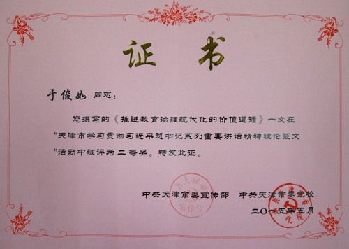 近日,由市委宣传部和市委党校联合主办的天津市学习贯彻习近平总书记系列重要讲话精神理论征文活动评选结果揭晓。星空党委宣传部于俊如教授撰写的理论文章《推进教育治理现代化的价值遵循》被评为二等奖,马克思主义学院李欣老师撰写的理论文章《从“权力清单”到“权利清单”:简政放权之实践、困境与路径研究》被评为三等奖。
