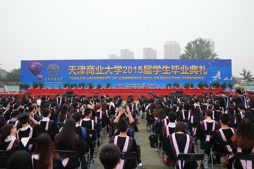 毕业典礼在庄严雄壮的国歌声中拉开帷幕。邱立成代表校学位评定委员会宣读 2015 届学生学位授予情况决议。葛宝臻发表了热情洋溢的讲话,对 2015 届毕业生表示祝贺,和同学们共同回顾了大学四年美好时光和学习、生活的点点滴滴,嘱咐同学们在人生新的起点、新的征程中要坚定自己的理想;坚守爱国的责任与情怀;坚守敬业的精神和情操;坚守诚信的品质和根基;坚定友善的心态和气度。嘱咐同学们毕业后面对新的环境、新的变化,要坚持终身学习,把学习作为一种生活方式;要持之以恒,坚忍不拔,无论是顺境还是逆境,都能坚持到底;要坚持积极向上的人生态度,成功永远不属于整天抱怨的人;要坚持以学致用,用自己的聪明才智服务社会。嘱咐同学们毕业后要始终踏踏实实的努力付出,不断充实自我、提高自我、完善自我,让人生无悔。面对成功与失败,要保持一颗平常心,胜不骄,败不馁,在拼搏中体会生命的价值,享受生活的乐趣。
