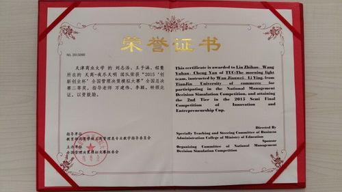7 月 25 日 -28 日,2015 年“创新创业杯”全国管理决策模拟大赛在上海第二工业大学落下帷幕,由经济学院经济学类专业学生刘志浩、程龑、胡伟平、裴力和国际教育学院财务管理(中澳合作)专业学生王予涵组成的“星空- 夜尽天明”代表队,在指导教师万建伟和李颖的带领下,表现出色,获得全国总决赛二等奖。