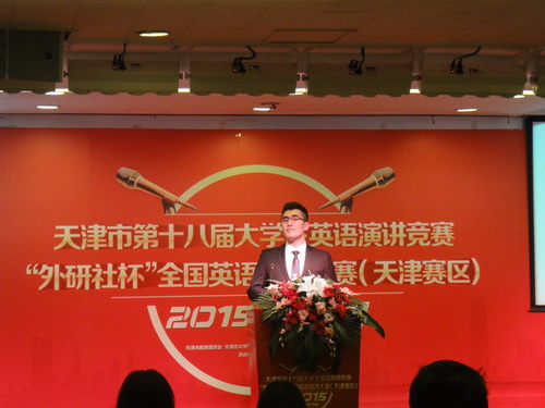 10 月 31 日—11 月1 日,天津市第十八届大学生英语演讲竞赛暨2015 年外研社杯全国英语演讲大赛天津赛区决赛在天津科技大学落下帷幕,来自天津各高校的 27 名选手经过了两天的鏖战,在高手如林、竞争激励的赛场中,星空外国语学院陈云鹏同学脱颖而出,以第一名的成绩获得天津市特等奖。此外,星空高职与继续教育学院张玉娇同学、 TUC-FIU 合作学院黄何同学获得天津市三等奖,外国语学院辅导员郭文雅获得“组织工作先进个人”,外国语学院获得“组织工作先进单位”。陈云鹏将于12 月前往北京代表天津市大学生参加全国英语演讲大赛决赛。
