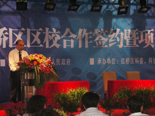 为探索新形势下高校建设与地方经济社会发展相结合的新途径和新模式,共同促进高校科学研究成果向生产力转化,为地方经济发展服务,达到共同发展的目的。5月22日在红桥区意库创意产业园星空刘书瀚校长与红桥区区长张泉芬分别代表双方签订了区校全面合作的框架协议,科研处长张坤生、商学院党总支书记张堃和物流系主任王侃与红桥区有关部门就重振百年老字号传统、大胡同地区经营业态提升、西站地区物流的整体规划等项目签订了协议,学生处处长贾青代表星空为意库创意产业园作为星空“大学生就业见习基地、创业实训基地”揭牌。在会上科研处处长张坤生还对星空优秀科研成果进行了项目发布。