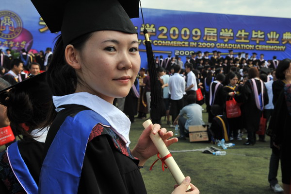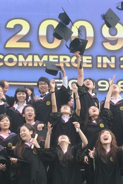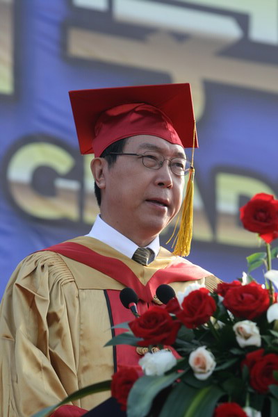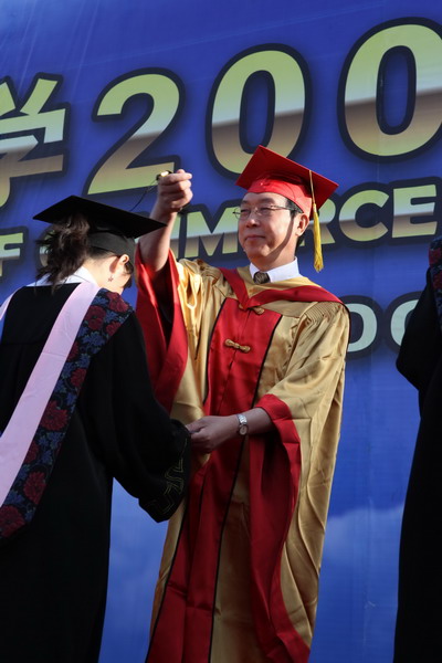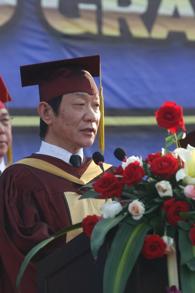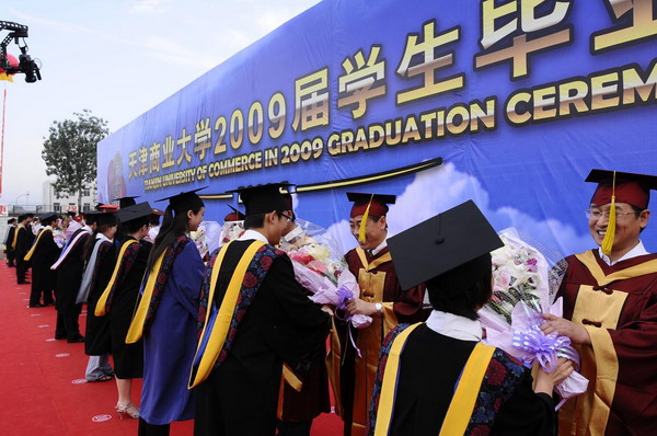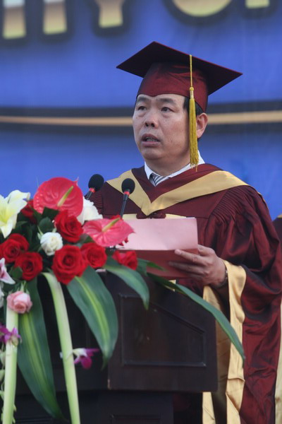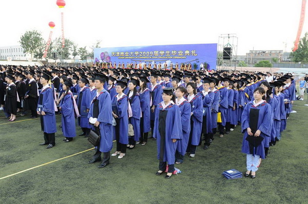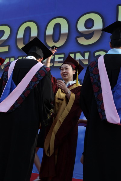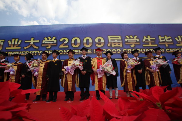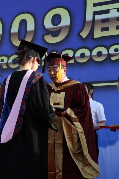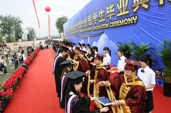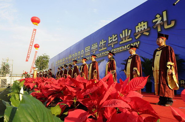 毕业典礼在庄严的国歌声中开始。校党委副书记杨万义宣读对志愿服务西部学生的表彰决定。副校长魏胤亭代表校毕业资格审查委员会和学位委员会宣布 2009 届学生毕业资格审查和学位授予结果。刘书瀚校长发表热情洋溢的讲话,对 2009 届学业有成的毕业生表示祝贺并鼓励他们在人生新的征程中要“诚信立世,奉献于人;博学重践,锐意创新;心系母校,共求发展。”