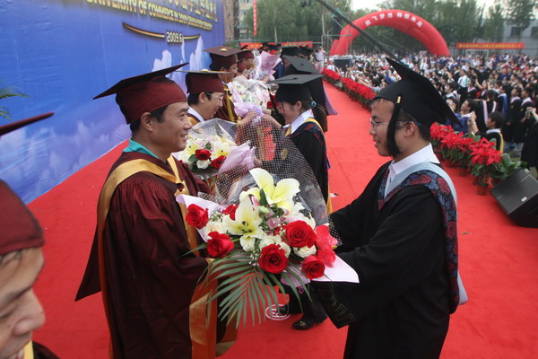 毕业生代表把鲜花深情地献给 23 位导师代表,感谢四年来老师为他们成长成熟付出的心血与汗水,感谢四年来学校为他们的成人成才做出的改革与实践。