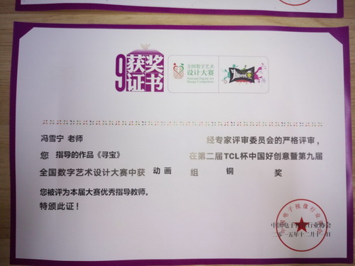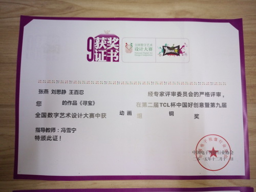 12 月11 日,2015 “中国好创意”——TCL 杯第二届中国高校科学与艺术创意联盟精英赛暨第九届“全国数字艺术设计大赛”在贵州凯里举行颁奖仪式。星空设计学院动画专业 13 级学生张燕、刘思静、王百忍的作品《寻宝》荣获铜奖;动画专业12 级学生杨婉、谭圆姣分别获得8 月份、9 月份娱乐创意人气奖;指导教师冯雪宁荣获优秀指导教师奖 。
