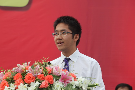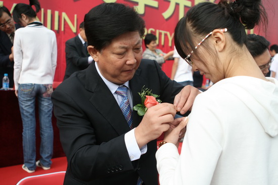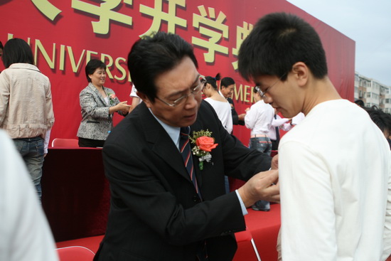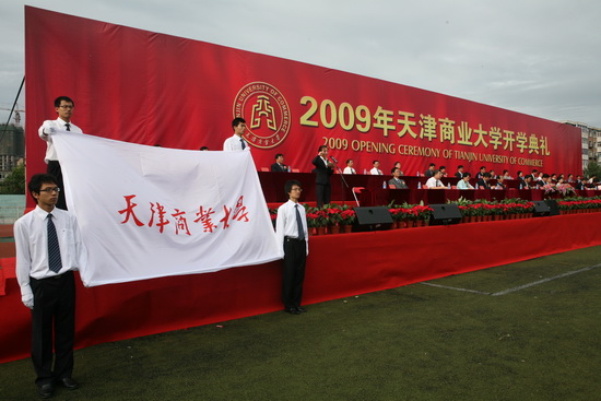 开学典礼在庄严的国歌声中开始。 2009 级学生工商管理类施崴代表全体新生发言。随后,校领导为 2009 级新生代表佩戴校徽。3900余新生戴上校徽举起右手向校旗庄严宣誓。