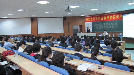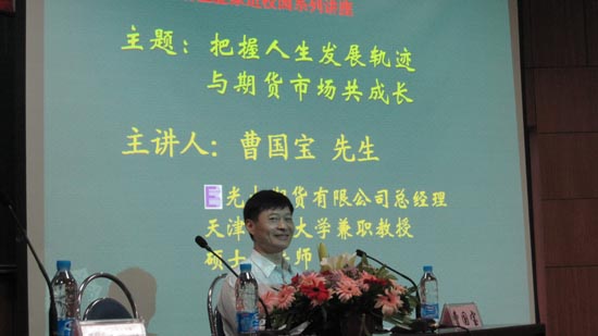 颁发聘书仪式后,曹国宝总经理在 3 号教学楼 110 教室为经济学院期货班一期、二期班的同学作了题为《把握人生发展轨迹,与期货市场共成长》的主题讲座,经济学院张宏武副院长主持了讲座。在讲座上,曹国宝总经理结合光大期货有限公司的发展历程以及企业文化、企业理念向现场的同学们详细解读了如何在激烈的市场竞争中把握自己,使自己成为期货行业的精英人才,曹国宝总经理深入浅出的讲解受到现场同学的热烈欢迎。