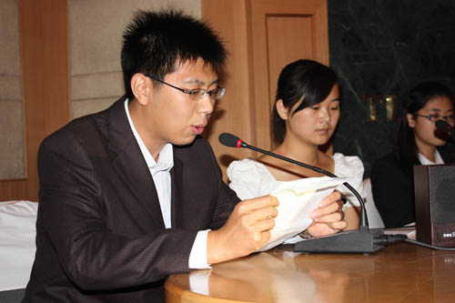 在“我与祖国共奋进”形势政策第一课后,同学们纷纷以论文的形式抒发内心的感受。社研会精挑细选出 13 篇优秀论文,编辑了《我与祖国共奋进》论文集。机械工程学院纪洪雨、理学院程玲和商学院李根的论文荣获前三名。座谈会上,他们三名同学作为代表与大家进行心得体会交流。他们从独特的视角感受着祖国的变迁,并将自己的成长与祖国的发展紧密相连。在场的同学踊跃发言,从社会、经济、农村问题和提高国民素质等方面各抒己见,引起大家的共鸣。社研会指导教师于俊如教授做了精彩的点评。