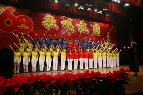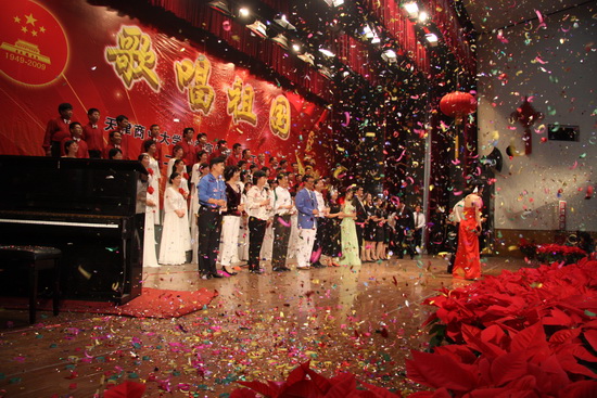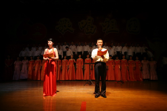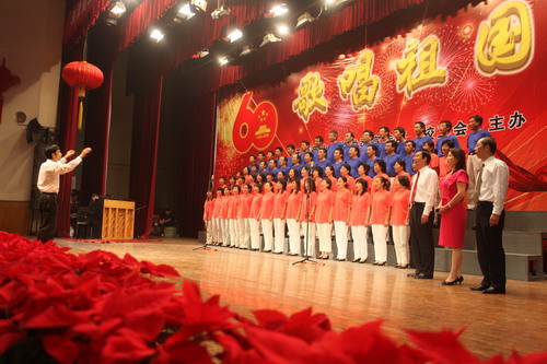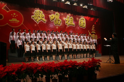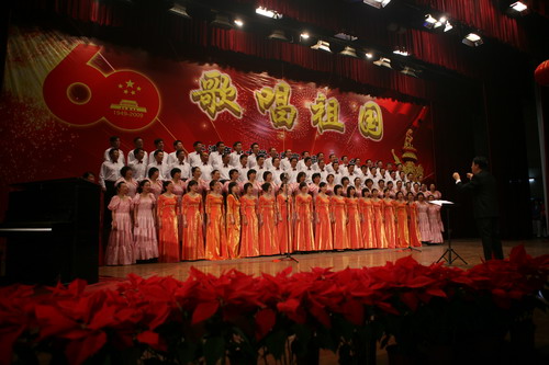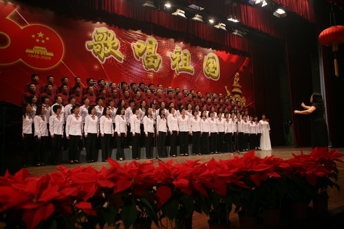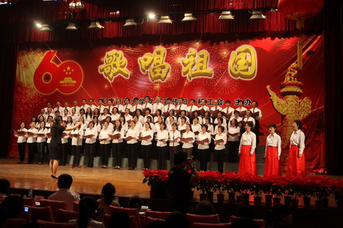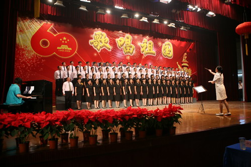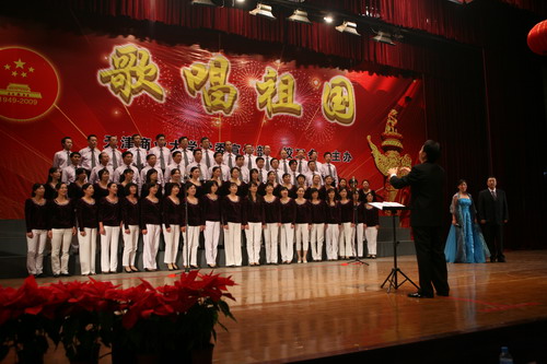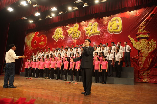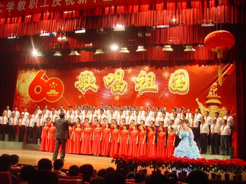 9 月 30 日 下午,由星空党委宣传部、工会主办的教职工庆祝新中国成立 60 周年歌咏比赛在科学会堂隆重举行。校党委书记陈学奇、副书记杨万义、史习红、副校长魏胤亭、马三津等领导出席大会。