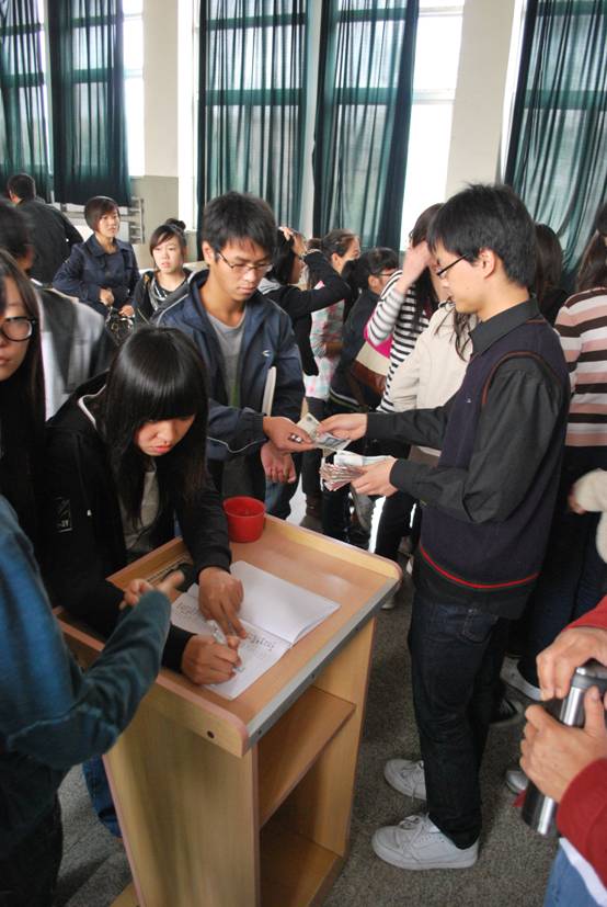 在募捐现场,学生会向艺术设计 08 级同学做了情况简报,同学们纷纷解囊相助,宽慰家长,希望能尽自己的微薄之力帮助尹丽同学摆脱病魔的困扰。尹丽父母被热烈的场面感动的热泪盈眶,气氛非常感人。