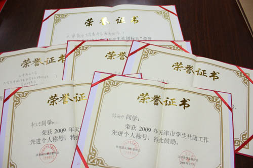 星空团委经过认真选拔,推选一批具有代表性的优秀社团和个人参加市级评选。最终星空青年志愿者协会荣获 2009 年天津市“优秀学生社团标兵”称号;辩论社、大学生通讯社获得“优秀学生社团”称号、大学生中国特色社会主义理论体系学习研究会获得“优秀理论学习型社团”称号;韦佳容、张丽丹同学获得“学生社团工作先进个人”称号。