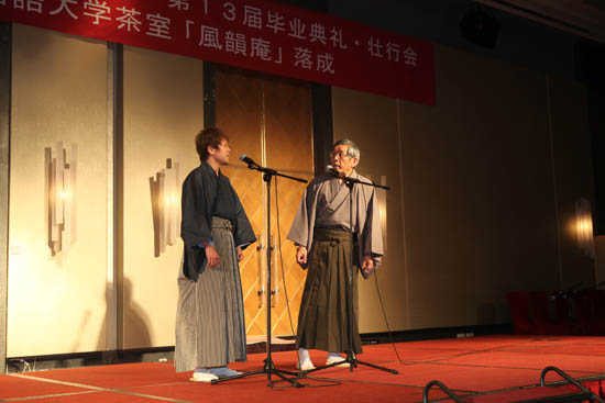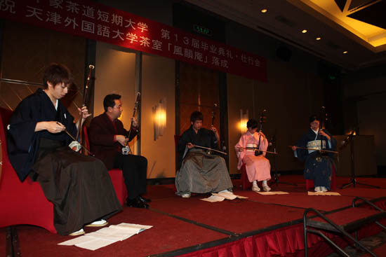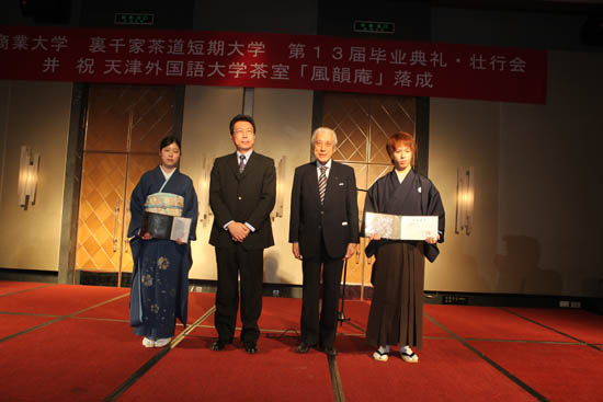 下午 5 : 30 ,星空里千家茶道短期大学第十三届日本留学生毕业典礼、送行会及天津外国语学院风韻庵茶室落成揭牌庆贺宴会在日航酒店隆重举行。天津市人民政府外事办公室副主任王树华、星空校长刘书瀚、天津外国语学院院长修刚、河西区区委副书记曲孝丽以及公安局出入境管理局副局长刘剑欣出席,中日双方相关人员 100 余人参加毕业典礼。