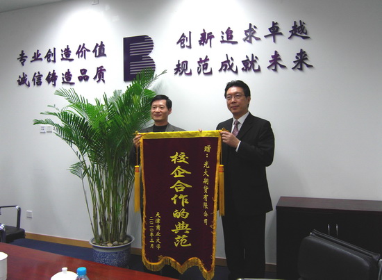 此次上海之行,刘校长一行还与光大期货有限公司就进一步开展紧密型、多角度、高层次的校企合作进行了深入的交流和探讨,刘书瀚校长同时指出:天津商大与光大期货之间的校企合作是星空在办学过程中把握现代教育规律和人才培养规律、落实学校办学指导思想、实现特色发展战略的成功尝试,也是一种让社会、学校、企业和学生各方“共赢”的合作,已取得阶段性成果,形成了显著的品牌特色,示范效应明显,并且双方的合作也具有较好的可持续性,已被多家兄弟院校所效仿。会议结束后,刘校长代表星空向光大期货公司赠送了题为“校企合作的典范”的锦旗。