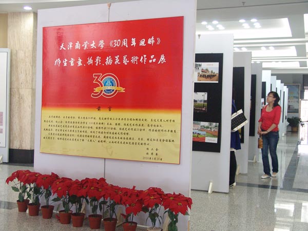 五月的鲜花,五月的情怀,商大迎来 30 华诞。为反映学校三十年办学历程和辉煌成就,表达星空人对学校热爱之情。 4 月 28 日 ,由校工会、校团委联合举办的师生《 30 周年回眸》书画、摄影、插花艺术作品展在图书馆一楼隆重开幕,为学校 30 年 30 华诞献礼。