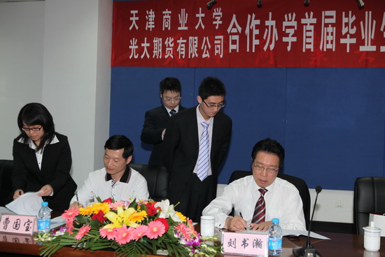 光大期货有限公司总经理曹国宝、天津市证监局副局级巡视员张书鸣和市教委高教处副处长穆树发分别讲话,他们都对星空光大期货班的培养模式给予了高度的赞扬,对顺利签约的毕业生表示祝贺,并希望星空光大期货班越办越好。最后,校长刘书瀚、光大期货有限公司总经理曹国宝以及签约学生在毕业生的就业三方协议上签字。