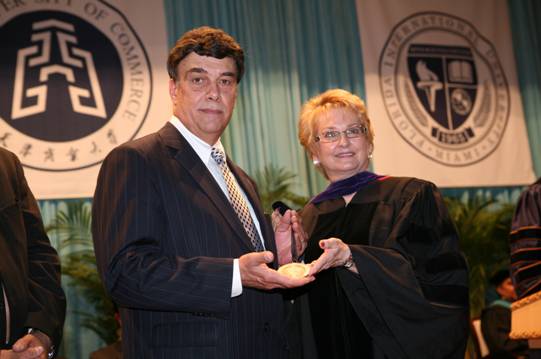 典礼中嘉宾为万豪集团副总裁Steve Bauman颁发了FIU勋章,表彰他5年来为中国所做出的卓越贡献。最后,198名毕业生依次走向讲台,接过美国佛罗里达国际大学酒店管理科学学士学位证书,为自己的四年大学生活划上完美的句号,合作学院2010届学生毕业典礼在热烈的掌声中圆满结束。