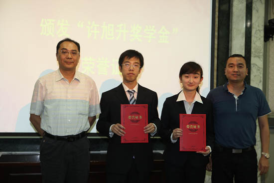 校纪委书记路波、广州玛茜特皮具有限公司总经理许旭升向“许旭升奖学金”一等奖获得者颁发证书