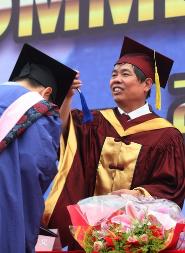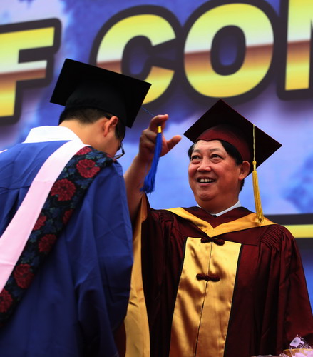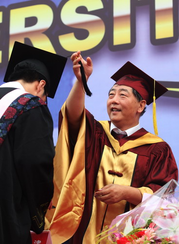 校党委书记陈学奇为毕业生颁发毕业证书和学位证书并拨流苏