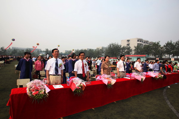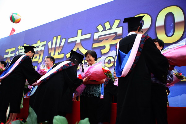 商学院林浩同学、机械工程学院韩杨同学代表 2010 届全体毕业生发言,深情表达了对母校的无限眷恋和对未来的美好憧憬, 40 位教师代表在典礼台上接受了 2010 届全体毕业生对所有老师的无尽感激和深深祝福。毕业生代表用献给导师和教师代表的一束束鲜花,表达出了内心对四年来老师为他们成长成熟付出心血与汗水,学校为他们成人成才做出改革与实践的最诚挚的谢意。