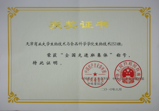 经学校和各级共青团组织、教育部门推荐、评审、公示等程序,共青团中央、教育部决定,对两年来在创先争优活动中取得突出成绩的个人和班集体予以表彰。共青团中央、教育部表示:这次受到表彰的个人和集体是全国广大青年学生和班集体的优秀代表,集中体现了当代青年学生奋发向上的精神风貌。受到表彰的先进班集体,有积极上进、遵纪守法、朝气蓬勃、文明健康的良好班风,有勤奋、务实、创新、诚信的优良学风,在社会实践、文化科技、志愿服务等活动中成绩显著,是全国大学生效仿的榜样。生物技术051 班,在近一年的层层选拔和考验中表现优异,最终获得“全国先进班集体”称号。