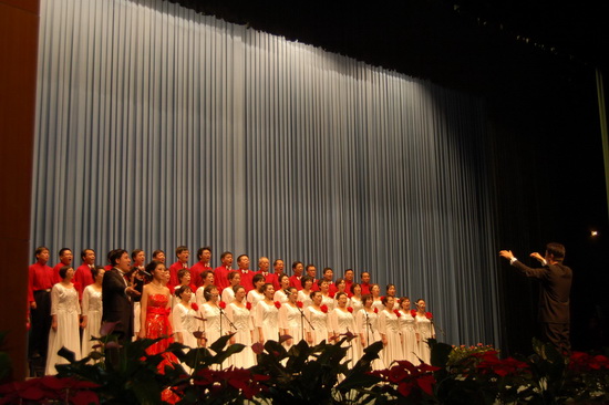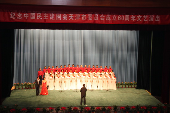 9月24日下午,为纪念中国民主建国会天津市委员会成立六十周年,中国民主建国会天津市委员会在市滨湖剧院隆重召开了庆祝表彰大会,民建天津市委会主委欧成忠及三位副主委出席,星空民建总支主任,合作学院院长王文君等出席大会。会上演出了由全市民建组织选派的文艺节目。星空教工合唱团与民建总支联合演出的大合唱《祖国颂》、《青春舞曲》,作为开场节目博得台下阵阵掌声。