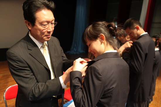专业教师代表Mohammad Qureshi教授在典礼上也对同学们的未来学习提出了要求;其后,双方领导为获得万豪奖学金、托福高分奖以及在某个领域做出成绩的的同学颁发获奖证书,并为08级学生佩戴FIU校徽;最后,08级学生代表与10级新生代表分别做了发言,他们表达了自己进入合作学院学习的激动心情,并表示要以百倍的努力回报学校领导与老师们对他们的培养,在学习和生活中不断成长与完善自我,成为品学兼优的酒店业优秀人才 。