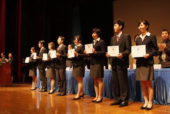 近日,根据美国万豪基金会的要求,经美国佛罗里达国际大学(FIU )酒店与旅游管理学院奖学金评定委员会严格评选,TUC-FIU合作学院2007级杨睿洁、赵云飞、任琳、谢龑、陈玉琛、齐瑶、于祥意和高梦晗等 8 名同学从众多申请者中脱颖而出,荣获每人32800 元的万豪奖学金。美国万豪国际酒店集团天津万豪行政公寓总经理Steven You先生专程到星空为获奖学生颁发了奖学金。