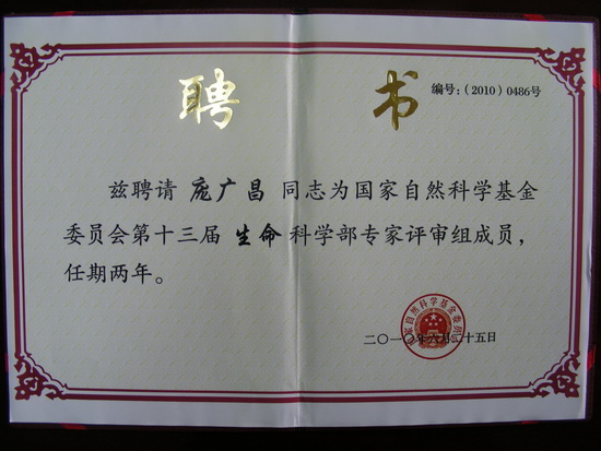 国家自然科学基金会委员会第十三届生命科学部专家评审组成员,任期两年。