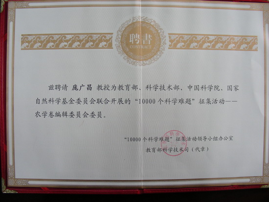 近日,生物技术与食品科学学院院长庞广昌教授教育部、科学技术部、中国科学院、国家自然科学基金会委员会联合开展的“10000 个科学难题”征集活动——农学卷编辑委员会委员。