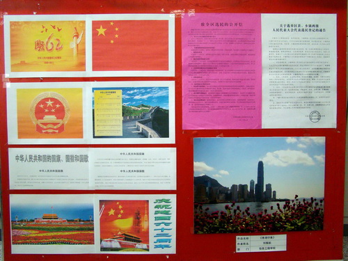 结合目前开展过程中的天津市红桥区人民代表大会换届选举工作,宣传栏还刊载了由天津市直接选举办公室颁布的《关于选举区县、乡镇人民代表大会代表选民登记的通告》与天津市红桥区选举委员会办公室《致全区选民公开信》。