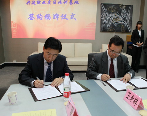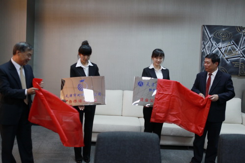 天津市对外友好协会副会长刘凤嵩、校党委副书记杨万义为实习就业基地揭牌