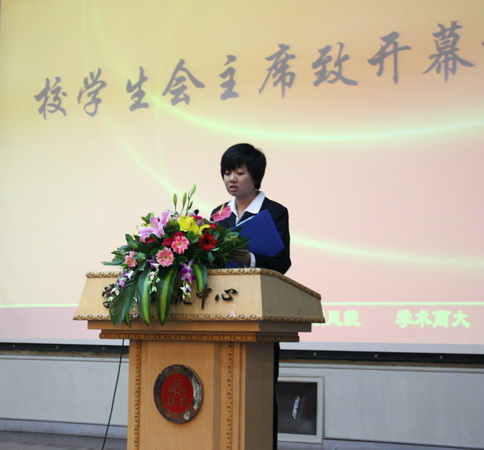 开幕式在以“百年辛亥 牢记历史”为主题的 DV 中拉开了帷幕。校学生会主席冯晓莹致开幕辞,她指出,本次活动应以百年辛亥为契机,传承辛亥革命精神,以“笃学 弘毅 明德 济世”的校训为指导,深化校园学术氛围。校学生会副主席兼学习部长刘畅宣读第八届“黄金学术月”的活动内容。校学生会副主席李咏乐宣读活动倡议书,倡导星空学子铭记辛亥历史,弘扬辛亥革命精神,敢为天下先,坚持不懈地传承中华民族精神。