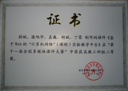 在本届大赛中,由星空信息工程学院选送的《基于 Web 的 < 计算机网络> (课程)实验教学平台》(作者:尉斌、潘旭华、孟巍、胡斌、丁雷)入围决赛,最终从 143 份参赛作品中脱颖而出,荣获高教工科组二等奖,并由教育部教育管理信息中心颁发了获奖证书。