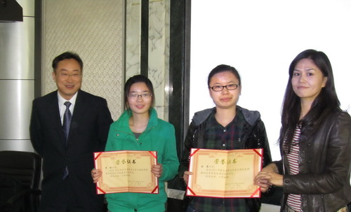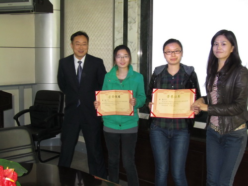 张秘书长首先介绍了上海校友理事会优秀毕业生奖学金设立情况,庞文生主任代表学校给上海校友会颁发了捐赠证书,上海校友会会长李佳宣布了经济学院学生徐慧和信息工程学院学生李艳获得奖学金,庞文生主任和李佳会长分别给学生颁发荣誉证书和奖金。获奖学生随后进行了发言,对上海校友会表示衷心的感谢,并表示今后一定努力学习、工作,不辜负校友的期望,以优异的成绩来回报母校和校友。