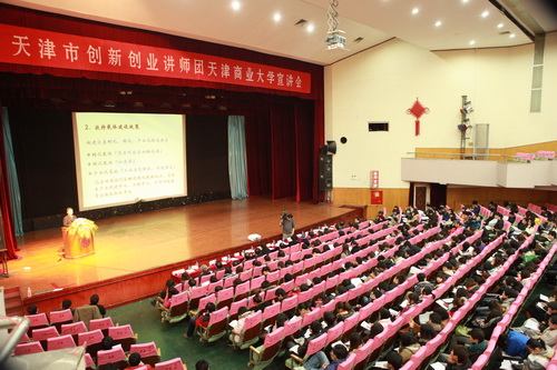 宣讲会由天津市科委贾堤总工程师主持。星空党委副书记杨万义致词,首先感谢宣讲团一行不辞辛苦来到星空开展宣讲活动,并简单介绍了近年来星空在产学研、人才培养等方面的合作与交流。杨书记表示,学校将抓住天津市实施创新创业驱动的大好机遇,统一思想,加强学习,捋顺机制,优化环境,在师生中加大创新创业宣传活动的力度,切实发挥高校服务社会的职能作用,进一步推进与天津市的全方位合作,共同探索为天津打造复合型创业型人才做出贡献的新模式。市科委副主任齐成喜为同学们讲解了天津市发展科技型中小企业及大学生创新创业的相关优惠政策。红桥区政府副区长华长虹向同学们介绍了红桥区打造创新创业人才的战略背景、总体思路和主要举措,以及红桥区的地理位置及历史背景,鼓励同学们抓住创新创业的契机,努力创业,为红桥区的经济发展给力。 三位创业成功人士:天津瞬清科技发展有限公司总经理黄正衍、天津市绿领产业园管理有限公司总经理王钟钦、天津市维度科技发展有限公司经理(原星空信息学院 09 届毕业生)张弢分别结合各自的创业历程与大家分享了自己科技创业的经验和心得体会。