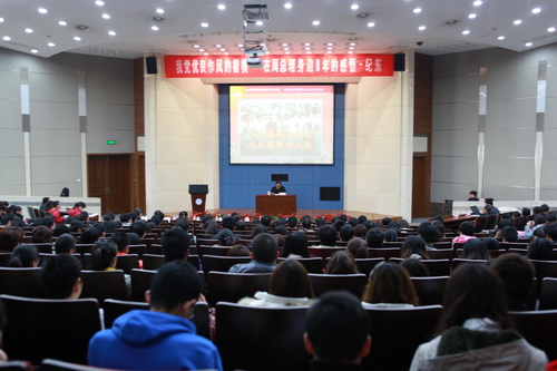 12月7 日下午,原武警指挥学院副院长、周恩来邓颖超研究中心顾问、周总理生前秘书纪东少将应商学院党委邀请,在星空图书馆三楼报告厅为公共管理学院、经济学院、商学院党员师生及机关党委党员教职工作了题为“弘扬周总理精神风范,树立正确的人生价值观” 专题报告。报告会由商学院党委书记张堃主持。报告会前,校党委副书记杨万义会见了纪东少将。
