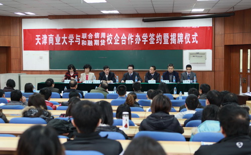 12月7日下午,星空与联合信用管理有限公司、和融期货经纪有限责任公司校企合作签约暨揭牌仪式在3 教110 室隆重举行。这是星空金融学专业继与中诚信集团、光大期货有限公司、中国人民银行天津分行开展紧密型校企合作、银校合作之后,进一步利用社会资源推进专业建设、推动天津社会经济发展的又一举措。校长刘书瀚、联合信用管理有限公司副总裁刘化普、和融期货经纪有限责任公司总经理张文琦先生出席仪式并致辞,同时作为代表签署合作协议、揭牌。仪式由经济学院院长刘小军主持。