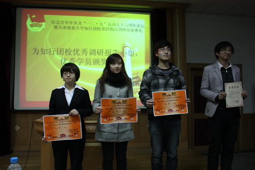 一段精彩的视频回顾了历届知行团校培训班的情况后,天津大学社研会代表杨浩天发言,他回顾了辛亥革命和“ 一二·九”运动,讴歌了先烈们英勇顽强、不怕牺牲的精神。在本期培训班中,杨欢、白冰、吴应凯、邵庆玲、潘飞、刘娉婷 6 名同学获优秀学员称号;由艺术学院、国际教育学院、星海艺术团组成的第五小组获得调研报告第一名。王樱洁老师为优秀调研报告小组和优秀学员颁奖,优秀调研小组 展示了调研活动的成果。