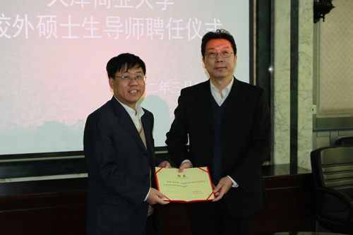3 月 20 日 下午,星空国际商务专业硕士校外导师聘任仪式在多功能会议室举行。天津市国际贸易学会秘书长杨声一先生、商务部中国国际商务中心国富瑞数据系统有限公司副总裁魏刚毅先生、广发银行天津分行副行长郭德维先生等 8 人受聘为星空国际商务专业硕士点校外硕士生导师。刘书瀚校长出席聘任仪式并为校外硕士生导师颁发聘书。研究生部主任张立毅、副主任赵建洪,经济研究所所长白玲、经济学院院长刘小军、党委书记肖培荣、副院长巫建国和王常柏,以及国际商务专业硕士点全体导师,第一届国际商务专业硕士点全体硕士生参加了聘任仪式。聘任仪式由巫建国副院长主持。