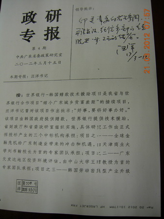 刘书瀚校长主持承担的世界银行韩国赠款技术援助项目的研究成果引起广东省委领导同志高度重视。 3 月 17 日,中共中央政治局委员广东省委书记汪洋在刊发此研究成果的《政研专报》上作出重要批示:“印送常委副省长参阅,并请发改、经信等部门负责同志进一步研酌借鉴。”