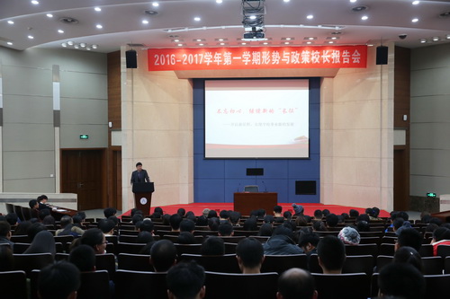 11月25日下午,由宣传部、学工部、校团委主办的2016-2017学年第一学期形势与政策校长报告会在图书馆国际报告厅举行。校长葛宝臻作了主题为“不忘初心,继续新的‘长征’,开启新征程,实现学校事业新的发展”的报告会。宣传部、学工部、团委主要负责同志,各学院分管学生工作副书记、辅导员、全体学生党员、主要学生干部300余人聆听了报告会。报告会由学工部部长王立云主持。