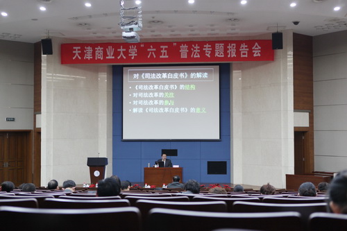 10月30 日下午, 2012 年“六五”普法专题报告会在图书馆国际报告厅举行,校党委书记陈学奇、副书记杨万义出席,报告会邀请到天津市普法宣传讲师团成员、星空法学院副院长吴春雷教授,报告会的主题是《中国的司法改革》白皮书解读,全校中层干部、各学院(部门)教工党支部书记、综合办公室主任等 200 余人参加了报告会,报告会由校党委副书记杨万义主持。