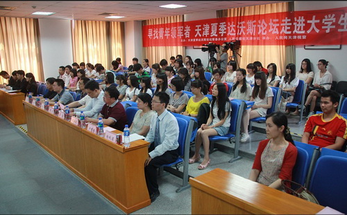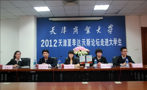 今年9 月,2012 年夏季达沃斯论坛将在我市举办,为了进一步宣传达沃斯论坛,深化大学生对达沃斯论坛的理解,校团委、经济学院与人民网天津视窗共同举办了“2012 天津夏季达沃斯论坛走进大学生”活动。6月14日下午,天津夏季达沃斯论坛筹备办公室处长张竣、处长马特,人民网天津视窗技术总监赵金波,南开大学经济研究中心周云波教授、郭树龙博士,校团委副书记严慧菁,经济学院教师、模拟论坛指导教师贾献东出席了本次活动。人民网天津视窗对活动进行了现场报道。