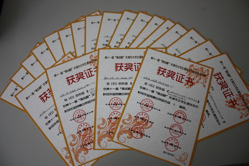 在刚刚揭晓成绩的第十一届“挑战杯”天津市课外学术科技竞赛决赛中,星空学生在指导教师悉心的指导下刻苦努力,不断创新,再创佳绩,共取得 21 项市级奖励,其中 11 项获奖作品由教务处 SRT 项目转化而成。在所有的获奖作品中,邹晓玫教授指导,商学院刘家瑞、刘昊博、郭晨煜、陈超、牟丁同学的作品《天津市北辰区刘家房子城中村改造中民生保障问题探访》获得特等奖;王庆、林枚教授指导,商学院纪彤、卢苗、胡雅莉、孙龙凤、刘耀阳、刘志的《大学生创业素质的培养与提升研究报告》等3 组同学的作品获得一等奖;黄震教授指导,机械工程学院周凡力、王丽艳、张静同学的《六棱形全方位灯管保护盒》等 5 组同学的作品获得二等奖; 王岭松教授指导,机械工程学院牛俊猛、倪惠娜、韩丹的《可回收型整垛堆码包装的结构及装备》等 12 组同学的作品获得三等奖;张堃、张立毅、王庆、邹晓玫四位老师获优秀指导教师称号。此外,校团委获得 “优秀组织单位”称号。