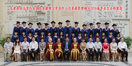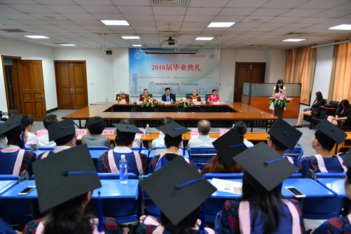 东密西根大学Fraya教授代表院长Michael Tidwell 在致辞中高度赞扬了中美两校之间的合作,并向2016届毕业表示衷心的祝贺。她指出,毕业典礼意味着公开承认学员们有能力完成了严格的专业学习,并有能力把所学应用于迎接各种商业社会的挑战。作为东密歇根大学硕士学位的获得者,学员们也有资格享有与其它任何公认的硕士学位获得者同等的机会、利益和荣誉,无论身在中国还是北美。享有权利的同时,学员们也肩负着巨大的责任,因此学员们必须对自己在伦理道德、公平公正和人格尊严上有更高的要求。最后她再一次祝贺和祝福毕业生同学们加入了全球 15 万东密西根大学校友的行列。