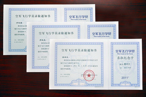于志强、董诗文、尹晨亮收到中国人民解放军空军招飞飞行学员工作局的录取通知书