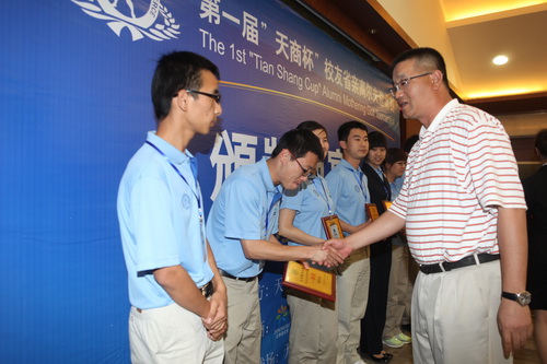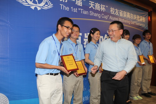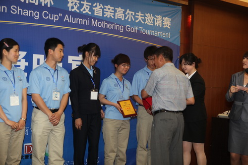 客座教授,福建隆德集团高尔夫体育事业部总经理余荣熙为获得企业助学金的获得者颁发证书