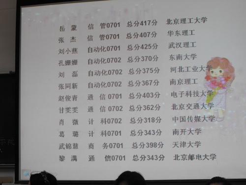 4月27日下午,信息工程学院在3教 214室举行了2011年考研经验交流会。学院党委副书记王艳军、学工办主任郭君伟出席,与同学们进行经验交流并给予具体指导。