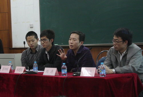 主持人围绕对创业的理解、在创业过程中遇到的困难、解决方法以及自己创业的心得等内容与嘉宾进行交流。刘建剑谈到,创业是一个资源整合的过程,要能够与志同道合的人形成合力,团队的成员之间要相互信任,相互合作。他还强调了环境对人的影响,告诫同学们要积极主动做事,真诚待人。董坤辉认为创业是大学生的一种实践,他在担任校学生会学习部部长期间,认识了许多人,这些人为他的创业过程提供了诸多意见和帮助,为创业打下了基础。张虎谈到,创业在很大程度上需要以创业者自身的兴趣为支撑,不管是成功还是失败,对于自己来说都是一笔财富,不要害怕失败,积累创业经验才是最重要的,要懂得珍惜自己每一次的付出。刘涛老师对创业做了深刻地阐述,他认为创业和就业的目的是一样的,创业者应该把创业视为一种走向社会的新途径,用一颗平常心去看待自己所具备的内在的品质,提高自己发现潜在问题的能力,并学会以一个社会人的身份去融入社会;在选择的过程中,要懂得给自己定位,不盲目跟从,但一旦确定目标就要努力去实现。在最后的现场互动环节,观众积极发问,嘉宾耐心解答,将现场气氛推向高潮。