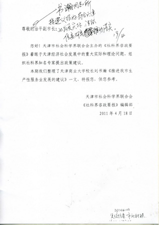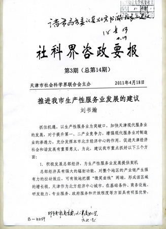 校长刘书瀚在天津市社会科学界联合会主办的《社科界咨政要报》2011年第3期上发表题为“推进我市生产性服务业发展的建议”,引起市领导同志高度重视,副市长王治平作出批示:“书瀚同志所提建议很好,符合天津的发展实际,请经信委研究推动落实”。副市长任学锋作出批示:“请市商务委认真研究书瀚校长的建议”。